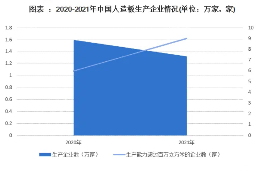 板材行業(yè)屬于“大行業(yè)、小公司”,競爭格局分散。我國作為人造板生產(chǎn)、貿(mào)易和消費(fèi)的第一大國,人均擁有木材資源不足,行業(yè)需求和供給增量逐步放緩,市場從高速發(fā)展期進(jìn)入平臺(tái)期,行業(yè)同質(zhì)化競爭激烈,凈利潤逐年下降。2021年底,全國保有人造板生產(chǎn)企業(yè)1.32萬余家,其中大型生產(chǎn)企業(yè)及企業(yè)集團(tuán)近190家,年生產(chǎn)能力超過100萬立方米的企業(yè)集團(tuán)上升至9家。市場集中度有上升趨勢。